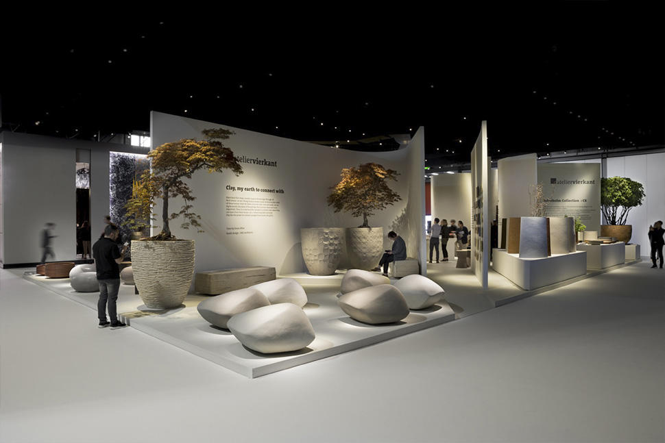 This year's stand has clay as the absolute protagonist, highlighted with scenic effects but through the use of discrete lighting bodies. By introducing clay into the realm of furniture, Atelier Vierkant enhances the use of a material that humans have been able to connect with ever since ancient times. Clay heritage returns in the round-shaped bathtubs, the complex body of the stone series, coffee tables, plates, stools, vases and larger vessels.